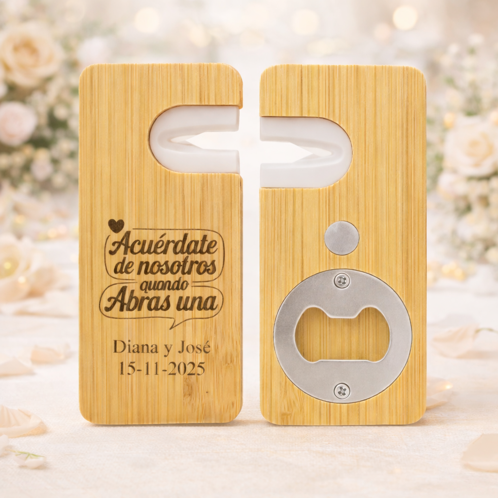 Por ello, si buscas un recuerdo útil y con significado para tu celebración, este abridor es una apuesta segura. No solo destaca por su acabado natural, sino también por la posibilidad de grabarlo con nombres, fecha o una frase especial.