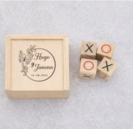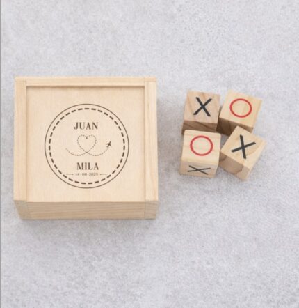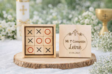 Original detalle de comunión juego 3 en raya de madera personalizado, presentado en estuche con tapa deslizante grabada. Un recuerdo divertido y práctico para invitados, ideal como regalo infantil de Primera Comunión.