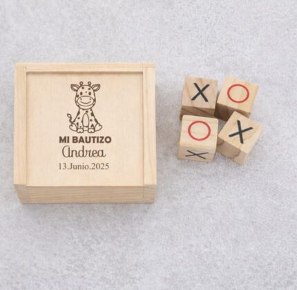 Original detalle de bautizo juego 3 en raya de madera personalizado, presentado en estuche con tapa deslizante grabada. Un recuerdo divertido y práctico para invitados, ideal como regalo infantil de bautizo