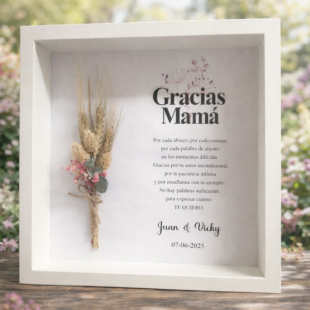 El cuadro personalizado con ramillete de flores preservadas es un detalle único que combina decoración y emoción en una pieza inolvidable. Diseñado para regalar a padres, abuelos, amigas, testigos de boda o cualquier persona importante, este cuadro transmite cariño y gratitud a través de un mensaje personalizado.