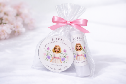 Pack personalizado con bálsamo labial y espejo, compacto y práctico para llevar en el bolso. Un detalle original y funcional, ideal como recuerdo para invitadas en cualquier celebración.
