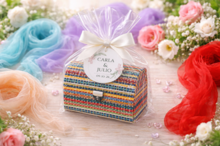 Sorprende a tus invitadas con estos elegantes pañuelos presentados en un bonito baúl multicolor, un detalle práctico y lleno de encanto para bodas, comuniones y eventos especiales. Confeccionados en poliéster suave y disponibles en varios colores, son el complemento perfecto para aportar un toque romántico y sofisticado a cualquier celebración.