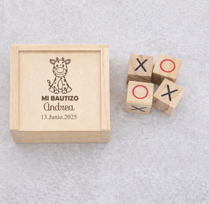El Juego 3 en Raya Grabado para bautizo destaca especialmente porque combina diversión y recuerdo sentimental. Además, después de la celebración, los invitados podrán seguir utilizándolo como juego portátil, manteniendo vivo el recuerdo de ese día tan importante.