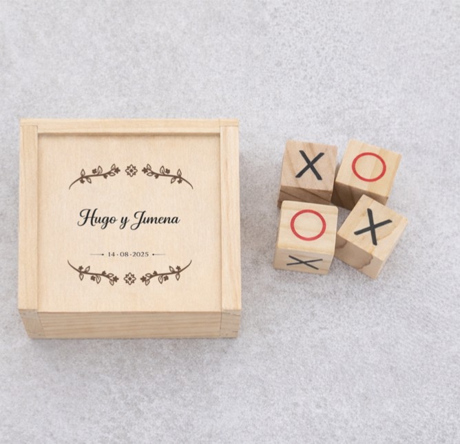 Fabricado en madera natural, el juego se presenta en un elegante estuche individual con tapa deslizante, lo que facilita su almacenamiento y transporte. Además, la tapa puede grabarse con nombre, fecha o mensaje del evento, creando así un recuerdo único y personalizado de la celebración.