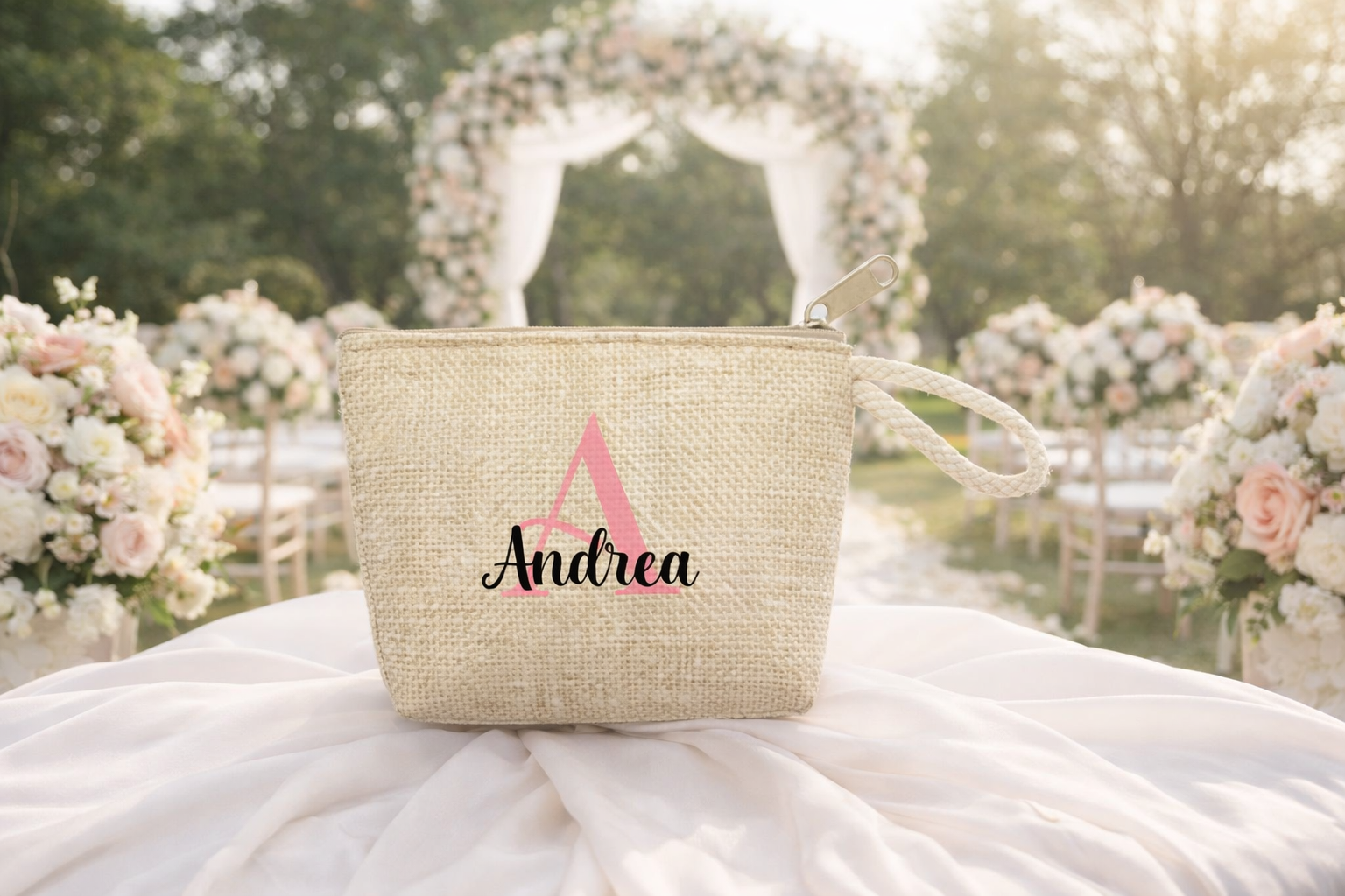 Este monedero de yute personalizado con inicial y nombre destaca no solo por su estética, sino también por su funcionalidad. De hecho, es un detalle que combina belleza y utilidad.