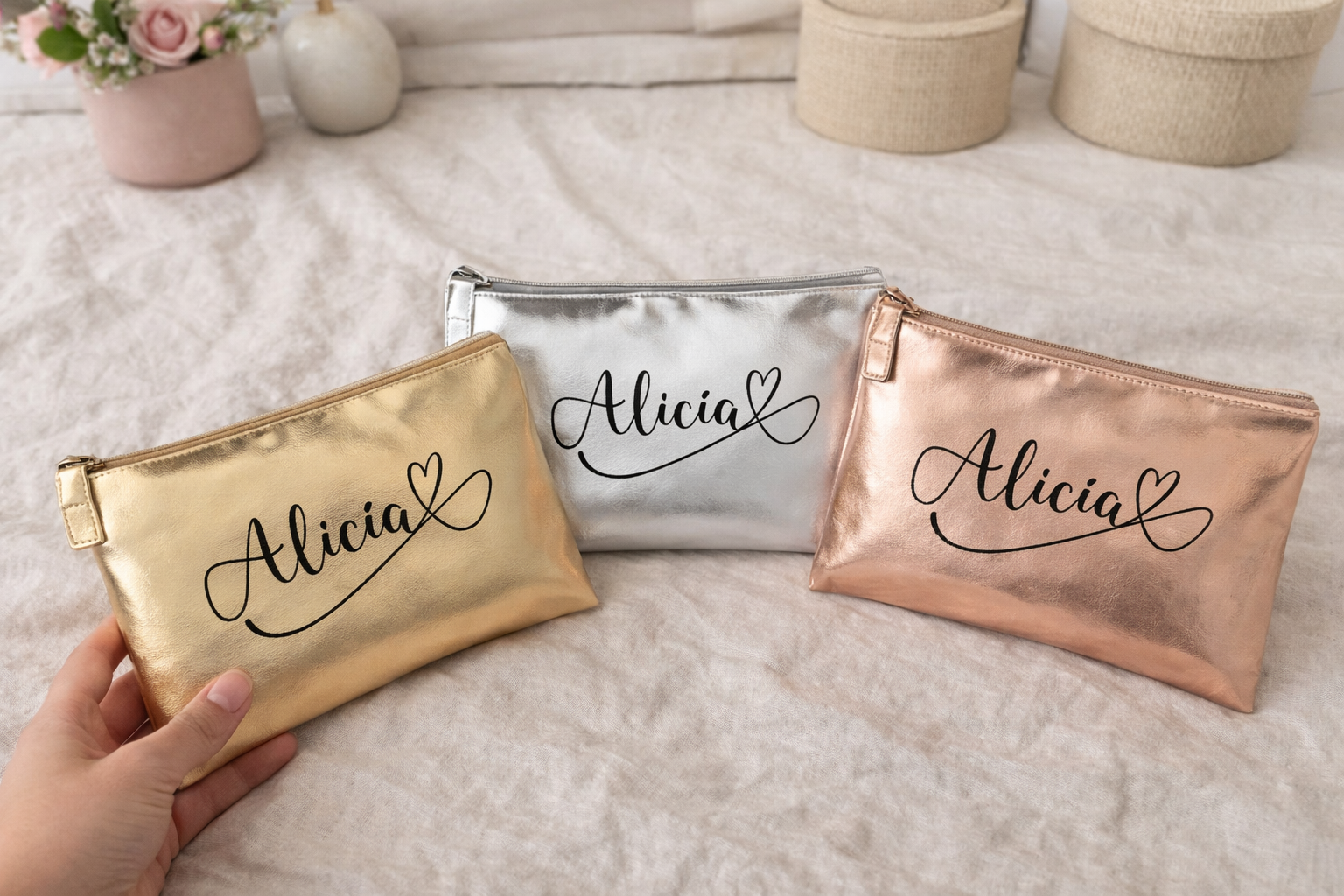 Si buscas un detalle que combine estética y utilidad, el neceser metalizado con nombre es una apuesta segura. Por un lado, resulta práctico para el día a día; por otro, su acabado elegante lo convierte en un regalo memorable.