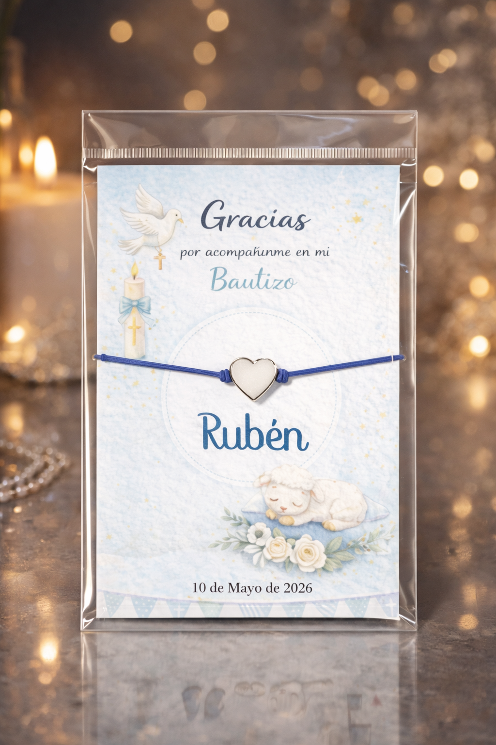 Cada pulsera de bautizo con tarjeta está pensada para ofrecer una presentación atractiva sin necesidad de preparativos adicionales. Es un detalle práctico que puedes colocar en la mesa de los invitados, incluir en bolsas de regalo o entregar personalmente.